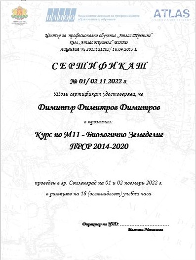- „Биологичното производство на зеленчуци като екологично съобразна алтернатива в прехода към устойчиво земеделие“ – 150 учебни часа